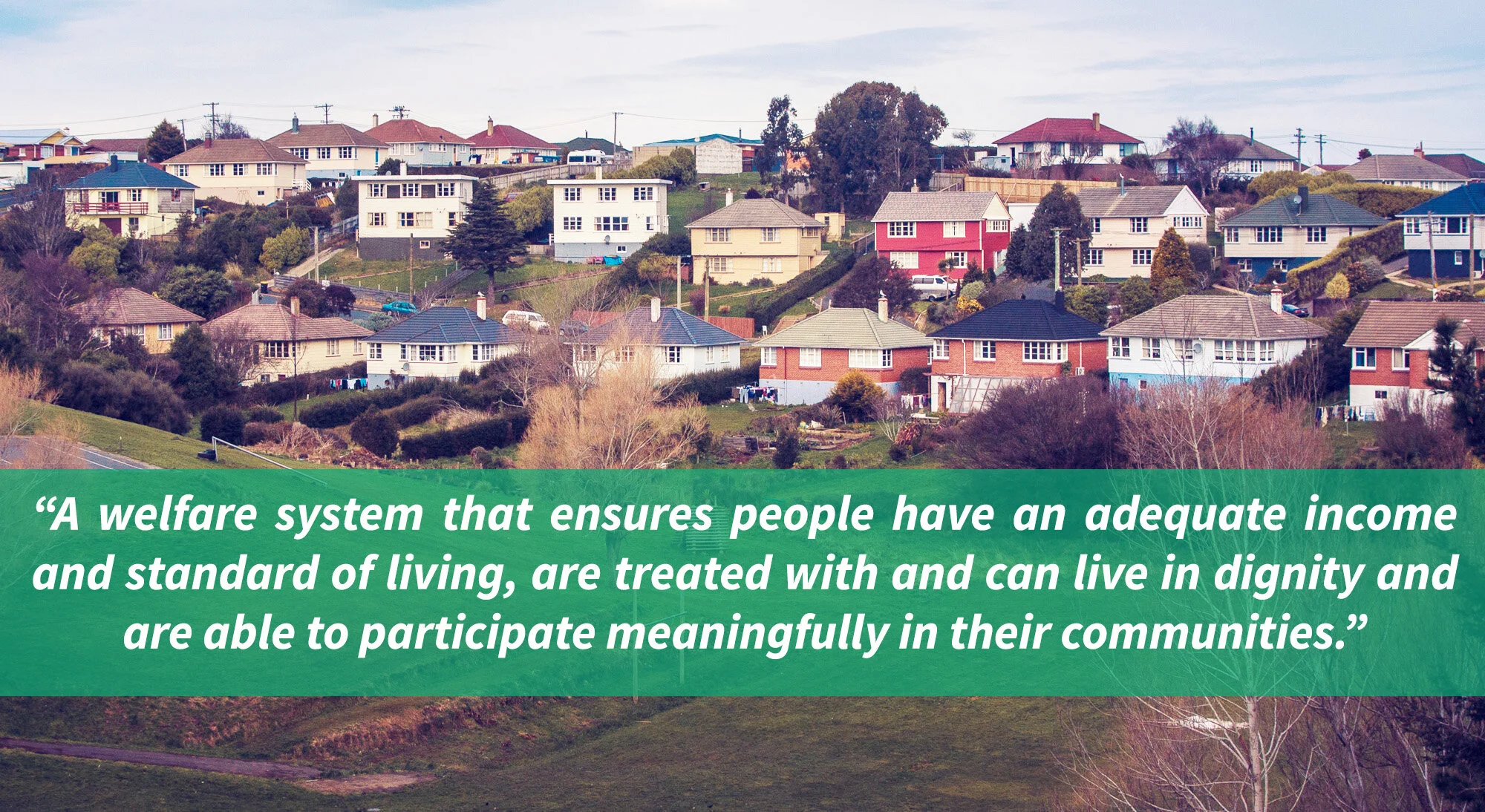 “A welfare system that ensures people have an adequate income and standard of living, are treated with and can live in dignity and are able to participate meaningfully in their communities.”